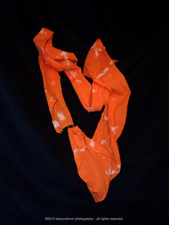While the design on this fundoshi appears quite random, it was created in a strangely meticulous fashion. I folded the lovely orange gauze like an accordion. Then the bleaching solution was applied along the edges of the folds. Depending on where the solution hit, and if the fold was even gives the results you see. The fabric was also dry, so there was little bleeding, making the white edges crisper. I’ve done the exact same process on wet material and the results are completely different. So, if you are trying your hand at this technique, I encourage you to do one with the material dry, and another with it wet….you may be delighted at the differences!